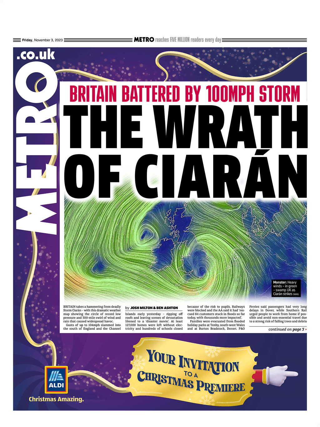 The Metro said Britain took a “hammering” from Storm Ciarán on Thursday. It reports that 127,000 homes were left without power, railways were blocked and families were evacuated from holiday parks.