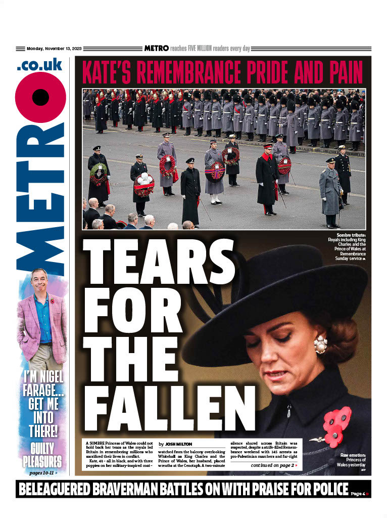Metro pictures the Princess of Wales on Remembrance Sunday underneath a picture of other members of the Royal Family. “Tears for the fallen”, its headline reads, as it looks beyond the politics and weekend unrest.
