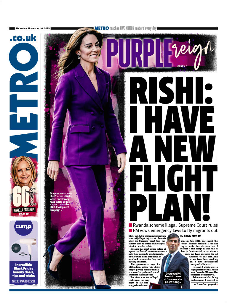 The Metro says Rishi Sunak has a “new flight plan” after the Rwanda scheme was ruled illegal. It also features a photo of the Princess of Wales wearing purple, featuring the caption “grape expectations”.