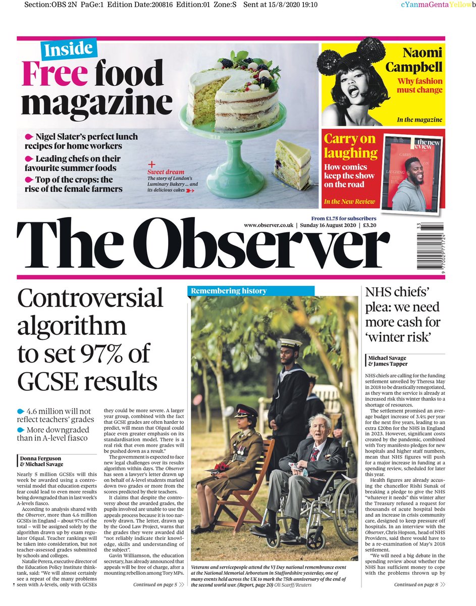 Ahead of nearly five million GCSEs being awarded this week using a controversial model, the Observer reports that 97% – more than 4.6 million grades – will be assigned in England solely by the algorithm drawn up by exam regulator Ofqual. More than 280,000 students had A-level results downgraded on Thursday, prompting widespread anger among schools, colleges and pupils. Education experts fear that even more GCSE results could be downgraded than A-levels, the paper says. The government is expected to face new legal challenges over its algorithm within days, the paper adds.