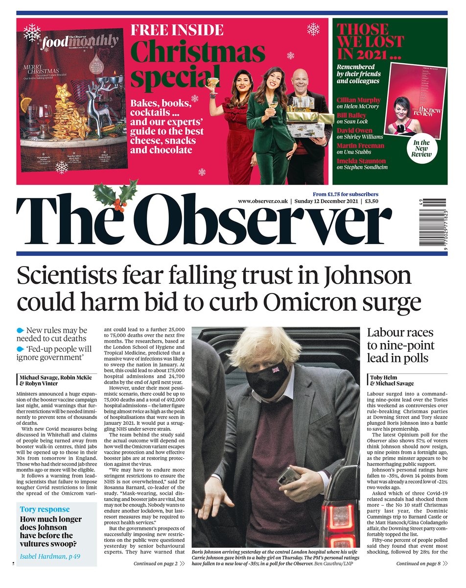 The Observer says scientists fear falling trust in Mr Johnson could harm plans to curb a surge in Omicron cases.