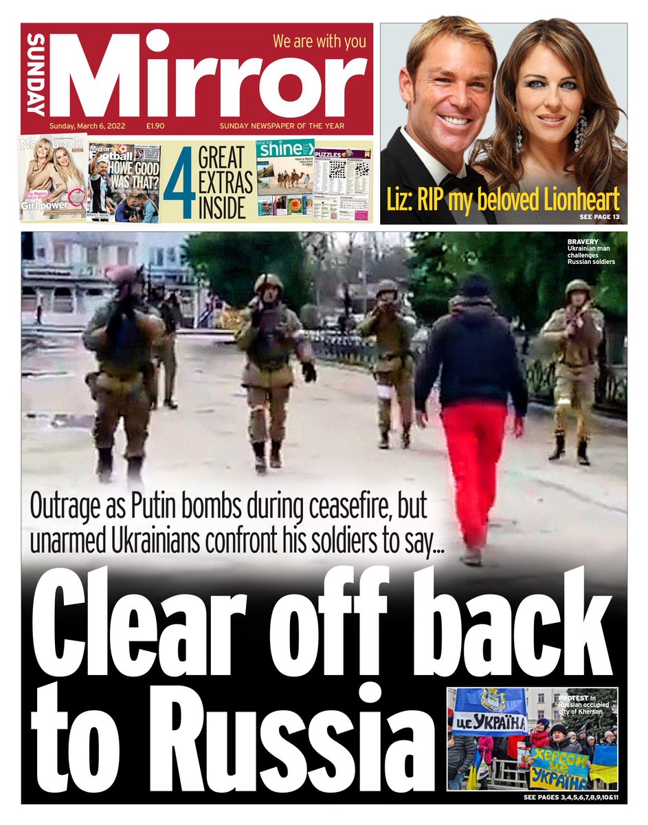 Leading on the same story, the Sunday Mirror says the move was met with “outrage”. It also features an image of an unarmed Ukrainian man confronting Russian soldiers.