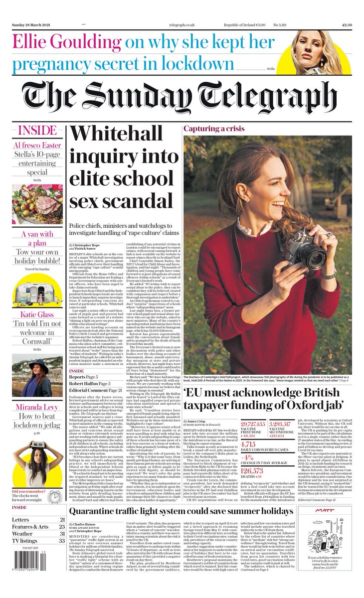 Elite schools are facing a Whitehall investigation over their handling of claims of “rape culture”, the Sunday Telegraph reports. It comes as thousands of current and former pupils come forward with allegations of abuse they received while at school, a senior officer has told the paper. The Metropolitan Police launched an investigation on Friday after reading distressing reports on the everyonesinvited.uk website. Meanwhile, Britain will tell the European Union that it must acknowledge the millions invested by British taxpayers into the AstraZeneca vaccine, the paper reports, amid continued tensions between London and Brussels over vaccine exports.