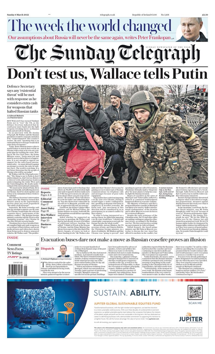 But Defence Secretary Ben Wallace has warned Mr Putin not to “test” the UK, the Sunday Telegraph reports, indicating that more funds could be directed to the light weapons “wreaking havoc” on Russian and aircraft in Ukraine. In an interview with the paper, Mr Wallace said the Russian president would be mistaken if he “underestimated” the UK’s resolve.