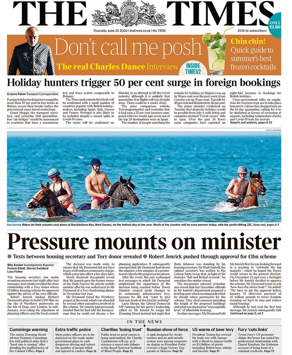 The Times says Mr Jenrick is under “mounting pressure” after text messages and emails revealed his “close relationship” with Mr Desmond, whose £1bn housing scheme was approved against the advice of his own officials.