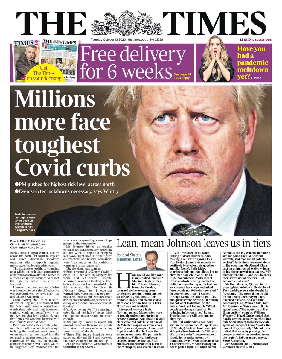 Boris Johnson is urging other council leaders across northern England to “step up and agree draconian lockdown measures”, following the new restrictions for Liverpool, the Times reports. The prime minister also hinted at tougher national action to come, saying he did not want to impose a complete lockdown “right now” but the figures on infections and hospital admissions were “flashing at us like dashboard warnings in a passenger jet”.
