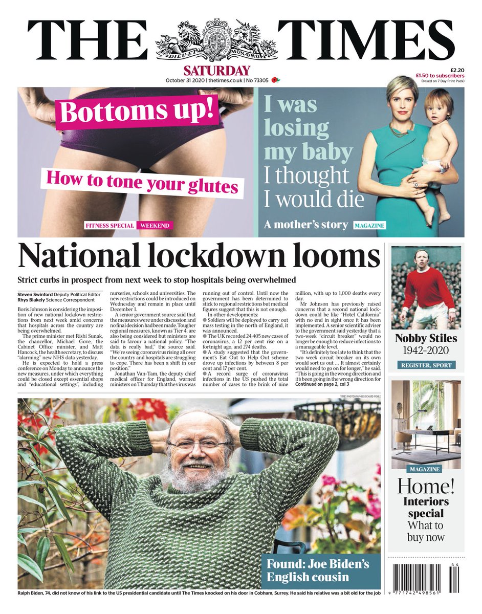 “National lockdown looms,” leads the Times and several of Saturday’s papers. Boris Johnson is considering imposing nationwide restrictions from next week, the Times reports, following concerns that surging cases could overwhelm the NHS. The paper adds that the PM met Rishi Sunak, Michael Gove and Matt Hancock on Friday to discuss new NHS data. A press conference is expected on Monday to announce the new measures, according to the paper, with new restrictions potentially introduced on Wednesday and remaining in place until 1 December.