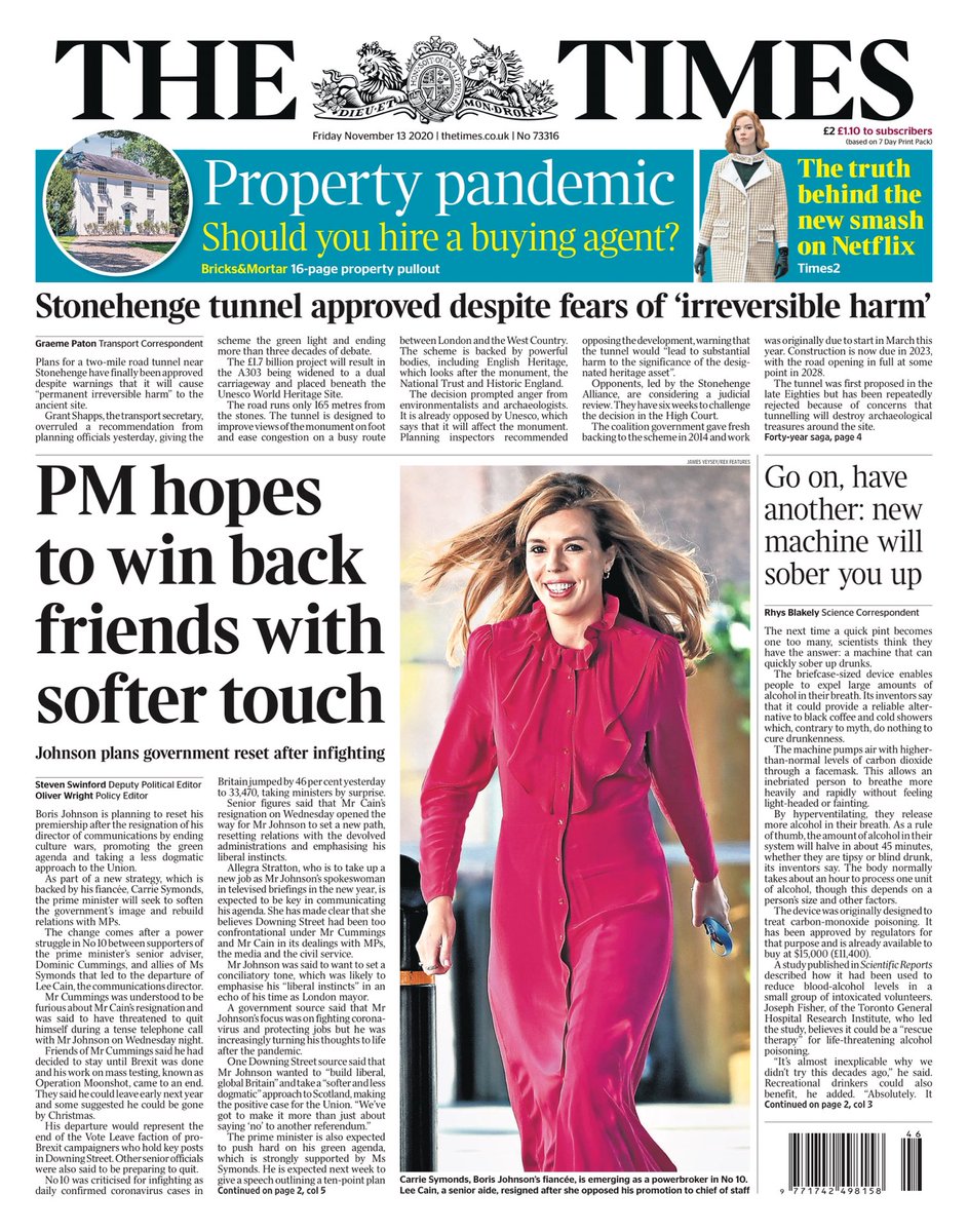 Boris Johnson is planning to soften the government’s image and rebuild relations with MPs as part of a new strategy, the Times says, which is backed by his fiancee Carrie Symonds. The paper suggests he wants to reset his premiership after the resignation of his director of communications by “ending culture wars, promoting the green agenda and taking a less dogmatic approach to the Union”. A caption below a picture of Ms Symonds says he is “emerging as a power broker at No 10”.