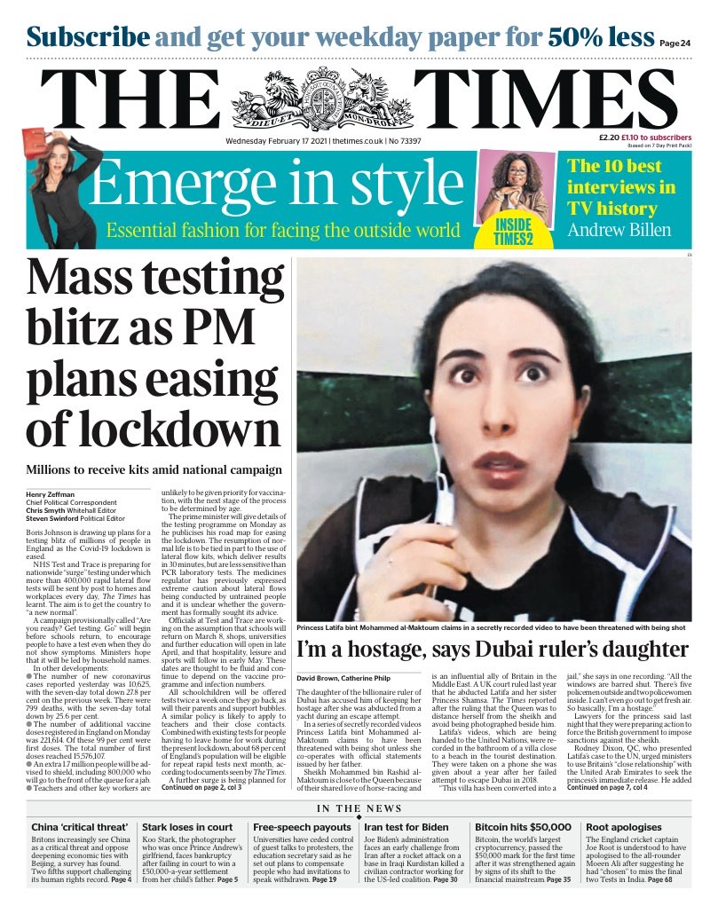 “Are you ready? Get testing. Go” is what the Times says is a draft slogan for a provisional plan to return the UK to a “new normal”. Under the scheme, 400,000 rapid lateral flow tests will be sent to homes and businesses each day, hoping to isolate asymptomatic cases, the Times says. Elsewhere, the paper pictures Dubai’s Princess Latifa bint Mohammed al-Maktoum, who has accused her father of keeping her hostage in a series of newly released videos.