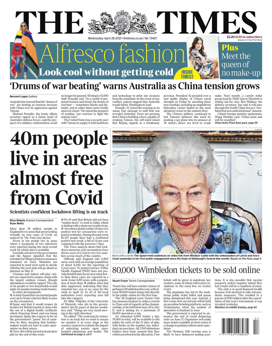 The Times echoes the theme as it reports an analysis that shows more than 38 million people in England live in areas that are recording virtually no new Covid cases. The paper says the data suggests the next phase of unlocking on 17 May should go ahead as planned. Elsewhere, it reports a warning by Australia that the “drums of war are beating” over tensions with China over Taiwan.
