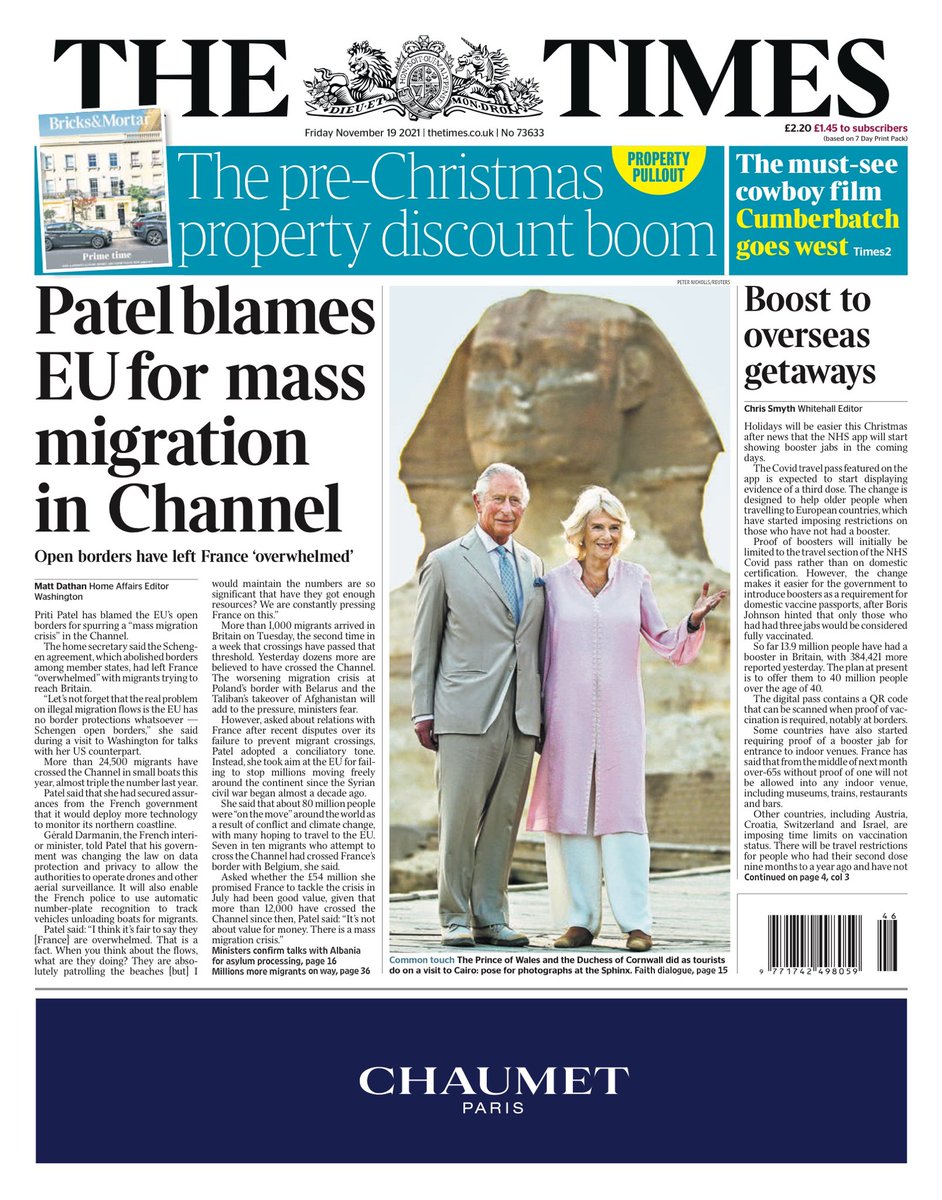 The Times leads on comments by Home Secretary Priti Patel who it says has blamed the EU’s open borders policy for for sparking a “mass migration crisis” in the English Channel. The paper also pictures the Prince of Wales and the Duchess of Cornwall in front of the Sphinx in Egypt during their visit to the Middle East.