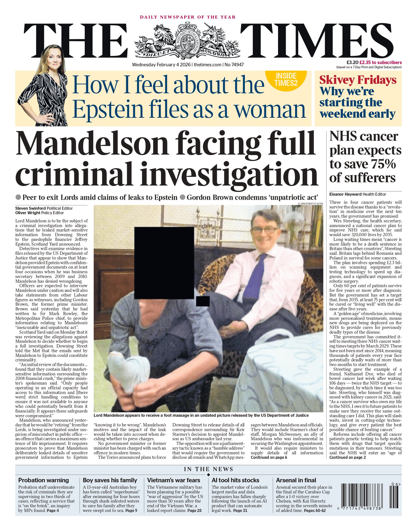 Scotland Yard is assessing allegations that Lord Mandelson leaked Downing Street emails and market‑sensitive information to Jeffrey Epstein. Papers released in the US triggered the review. Gordon Brown has urged a No 10 inquiry. Mandelson says he acted properly and denies any criminality.