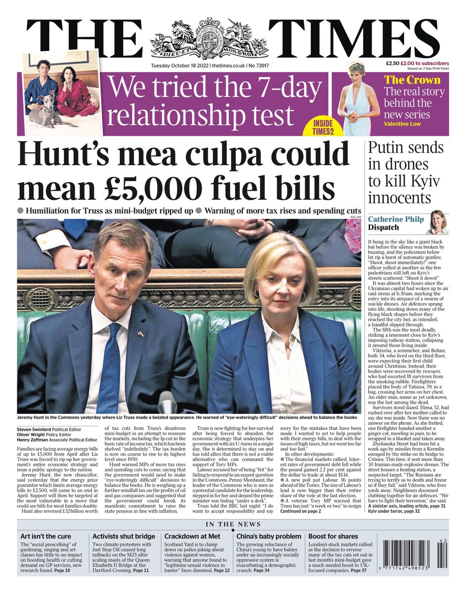 Families could face up to £5,000 energy bills from April after the PM was forced to rip up her economic plans, says the Times. Mr Hunt announced on Monday that the energy price guarantee will come to an end in April. The paper reports that Ms Truss is fighting for her survival after six U-turns on her plans in one day.