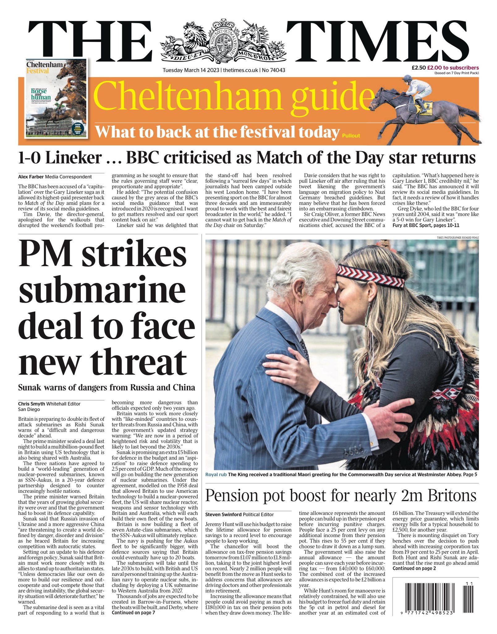 The Times reports that the UK, US, and Australia have agreed to build a “world-leading” generation of nuclear-powered submarines as part of a 20-year defence partnership. It says Prime Minister Rishi Sunak has warned that the years of growing global security are over and that Britain needs to boost its defence capability.