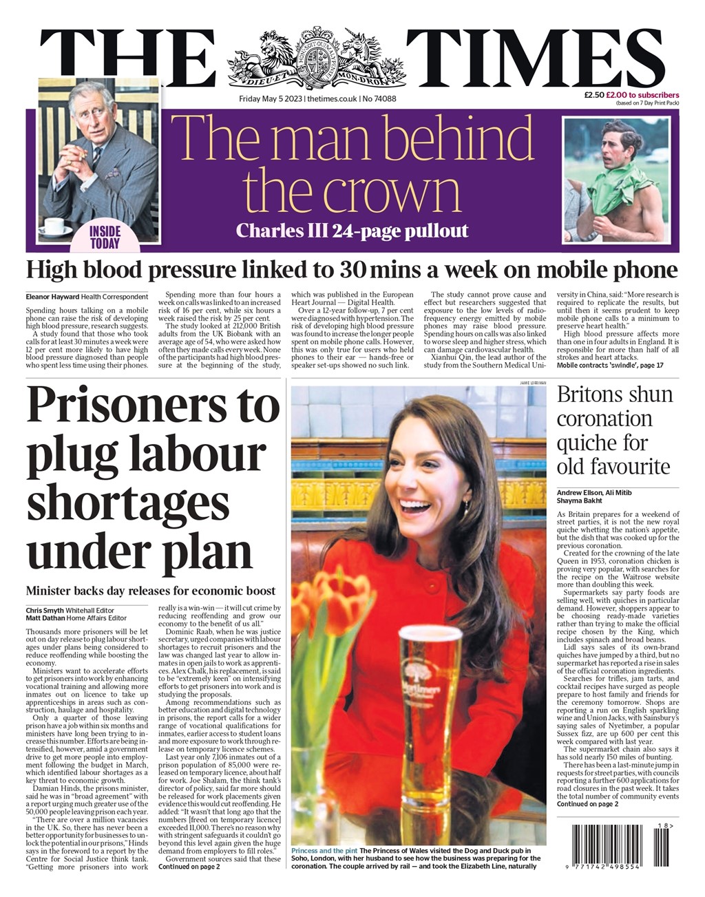 Thousands more prisoners could be let out on day release to fill labour shortages under plans intended to reduce reoffending and boost the economy, the Times reports. It comes after the Budget in March, which identified labour shortages as a key impediment to growth. The paper says that only a quarter of those leaving prison have a job within six months, and that inmates will be encouraged to take up apprenticeships in areas including construction, haulage and hospitality.