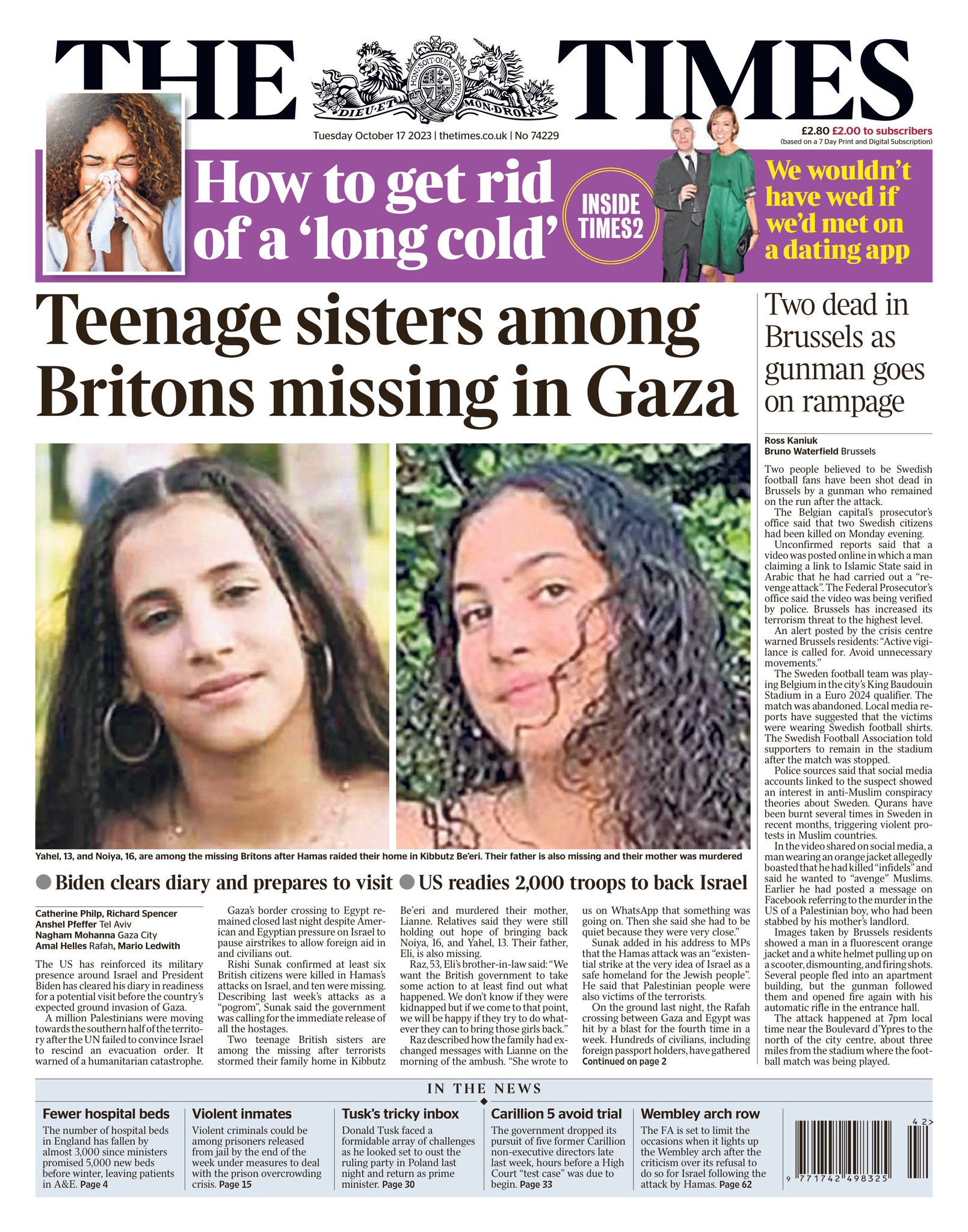 Two teenage sisters are among Britons missing in Gaza, reports the Times, carrying photographs of the pair on its front. It says their mother was murdered, and their father is missing. The newspaper also reports that two people believed to be Swedish football fans were shot dead in Brussels by a gunman who remained on the run after the attack.