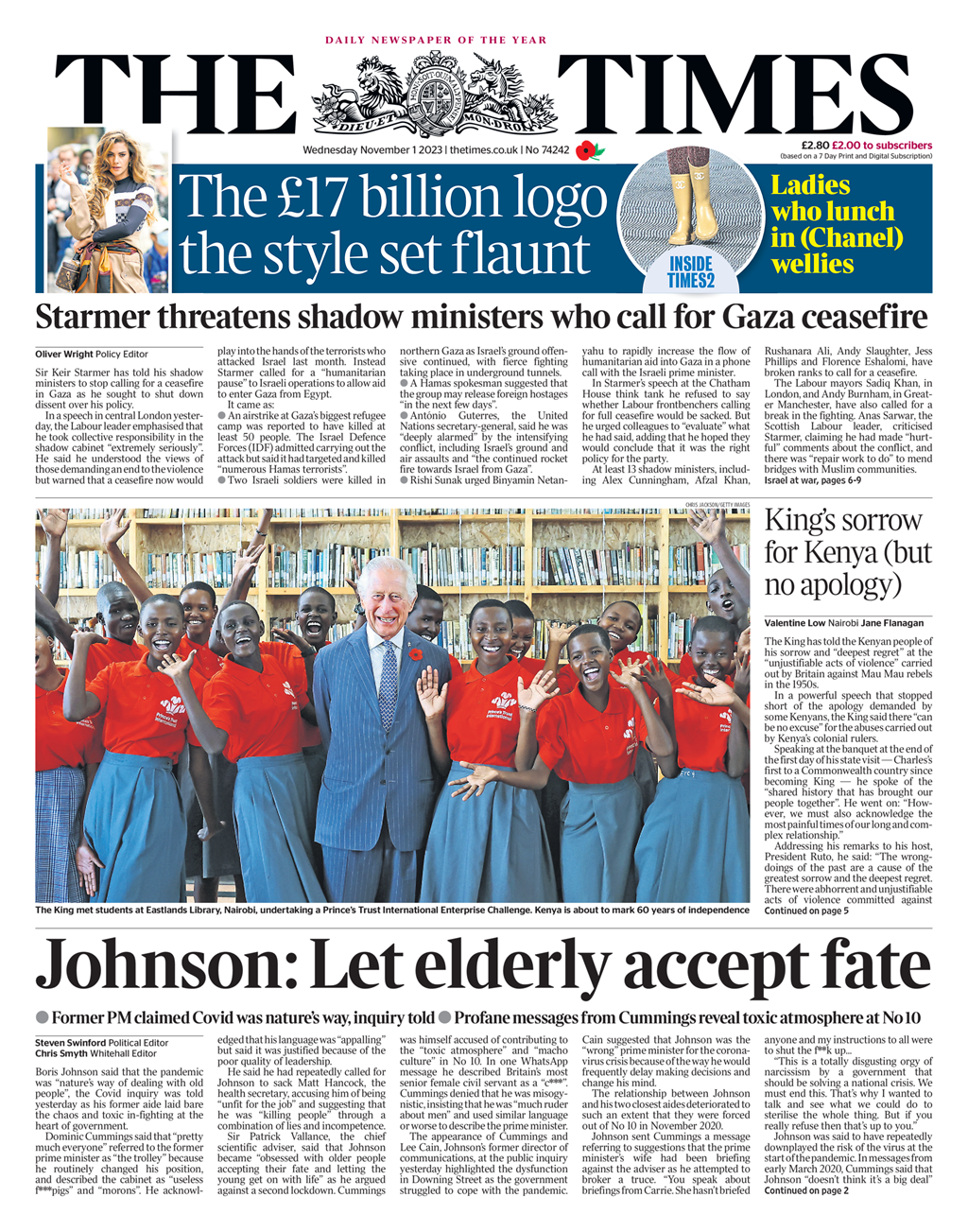 The Times focuses on the same line from the Covid inquiry, as well as covering a number of other stories on its front page, including King Charles’ visit to Kenya and Labour leader Sir Keir Starmer’s “threats” to his shadow ministers to “stop calling for a ceasefire in Gaza”. Keir Starmer is instead calling for a “humanitarian pause” in Israel, the paper reports.