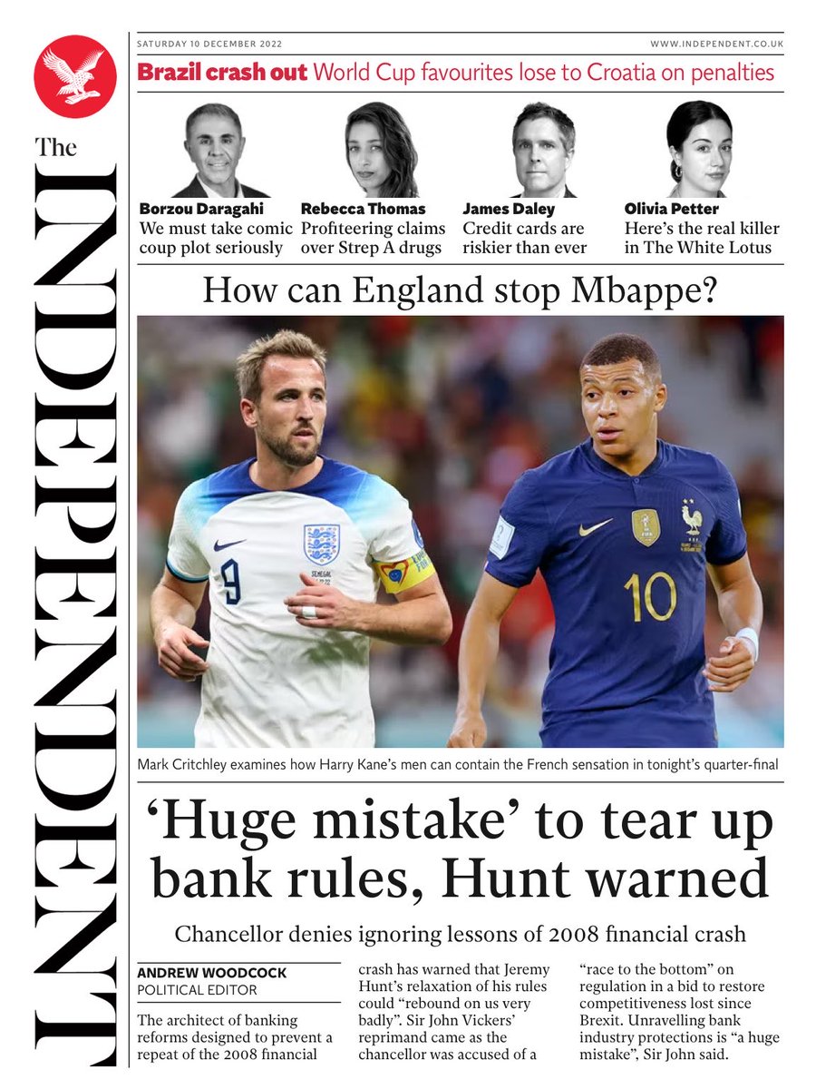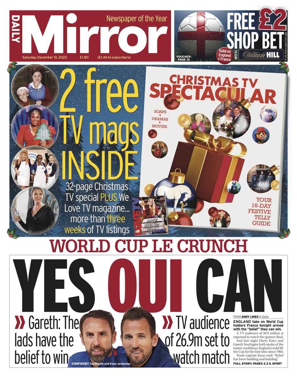 The Daily Mirror is dominated by England’s crunch World Cup match against France.