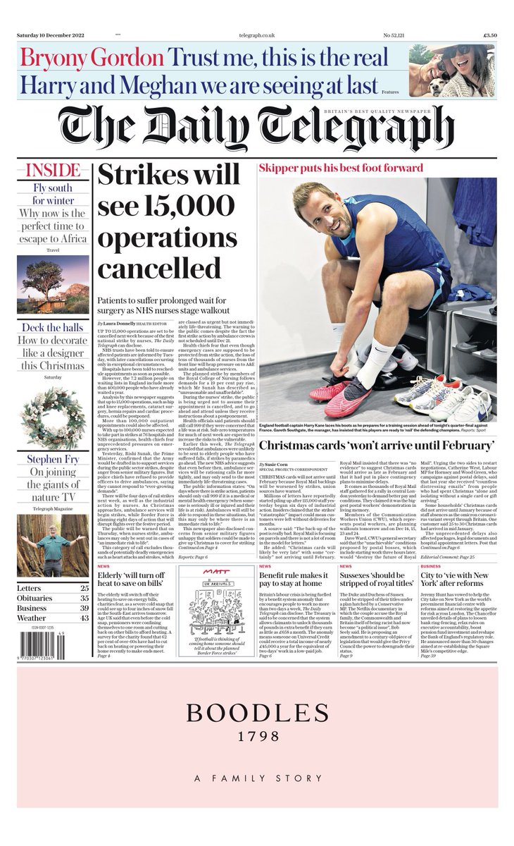 The Daily Telegraph reports that over 15,000 surgeries will be canceled due to a nursing strike next week.