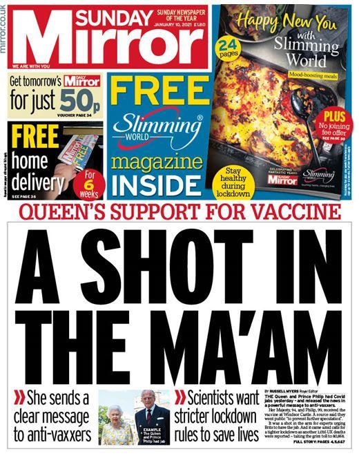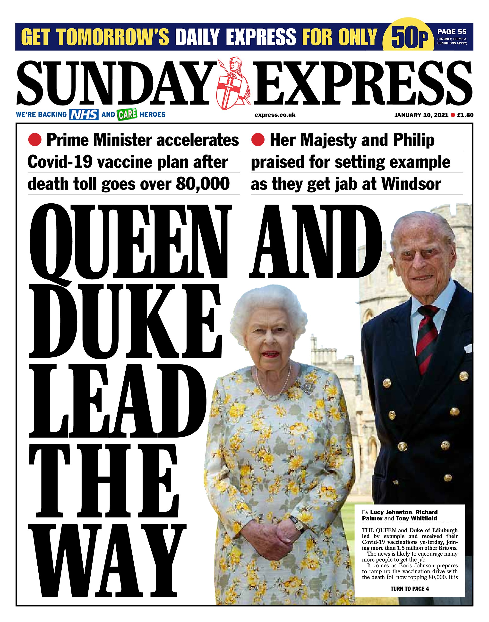 The Mail On Sunday praises the newly COVID-vaccinated Queen and Prince Philip, saying they have started a “jab blitz” in Britain and looks ahead to a time when four people will receive the vaccine every minute.