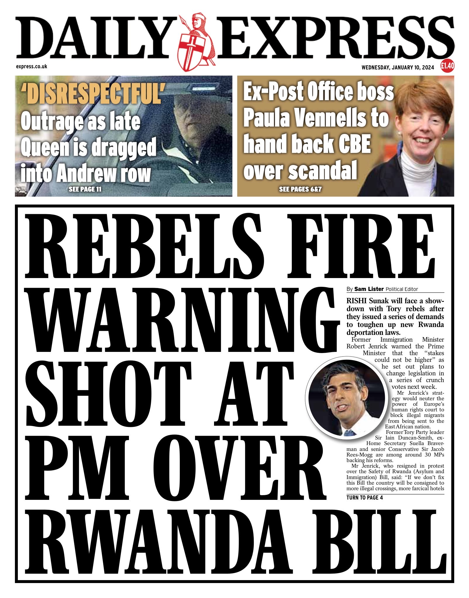 The Daily Express reports on Rishi Sunak’s impending clash with Tory rebels over Rwanda deportation laws.