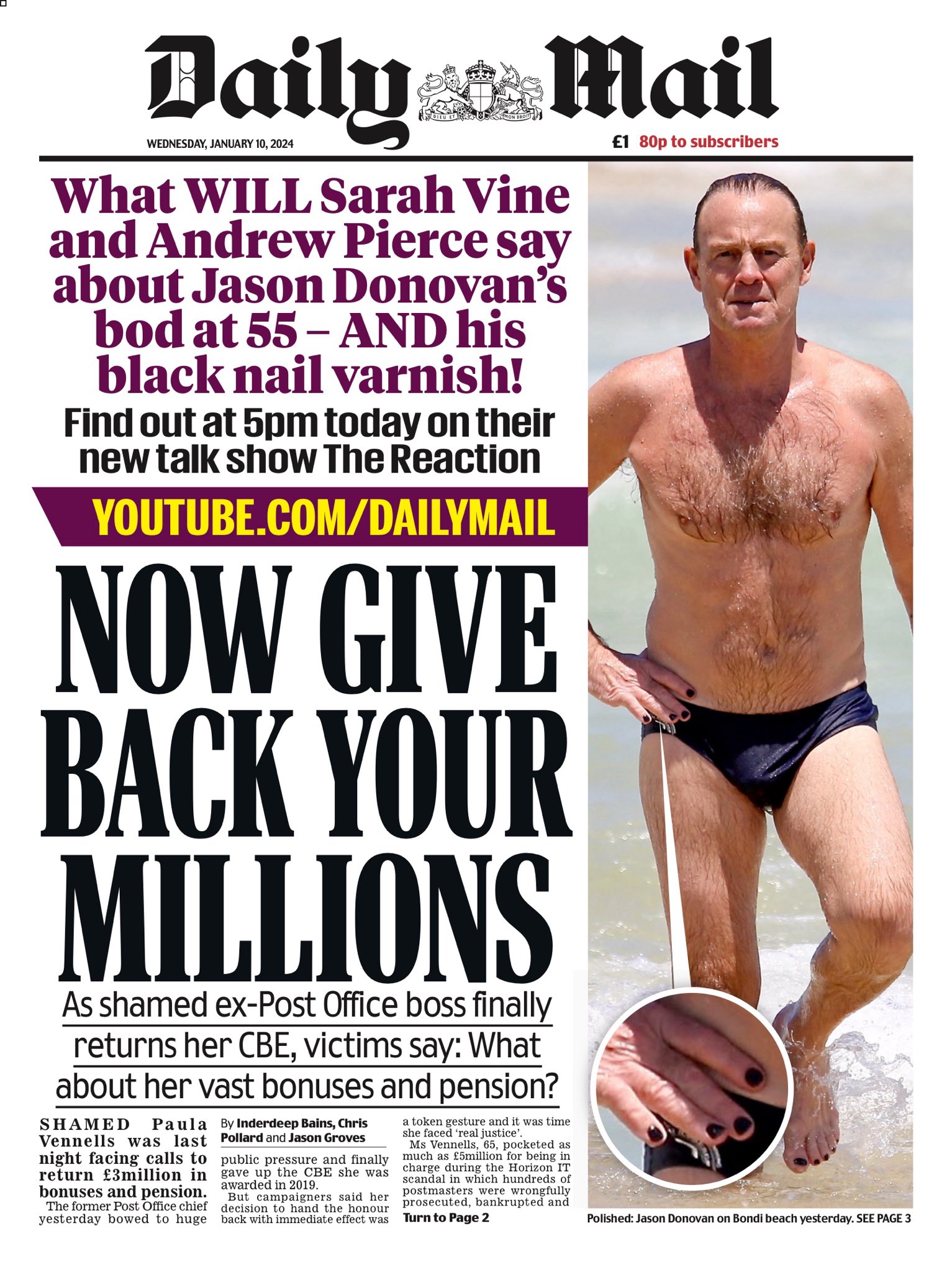 The Daily Mail reports on calls for ex-Post Office head Paula Vennells to return her £3m bonuses and pension.