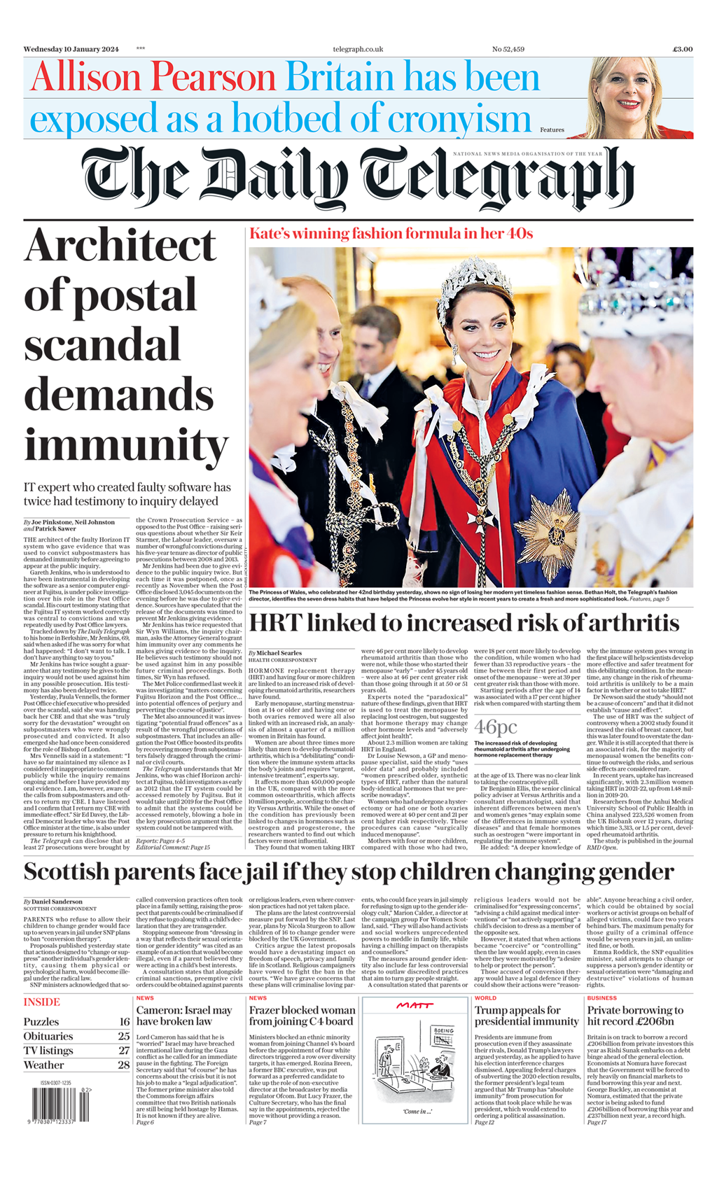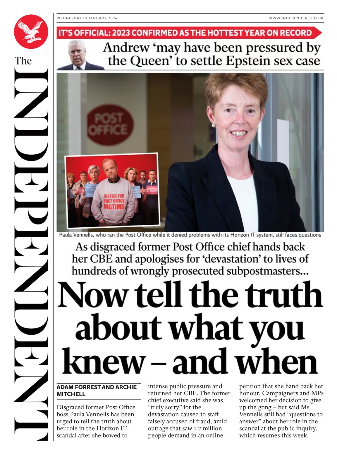 The Times reports on ex-Post Office CEO Paula Vennells’ decision to return her CBE following the Horizon IT scandal.