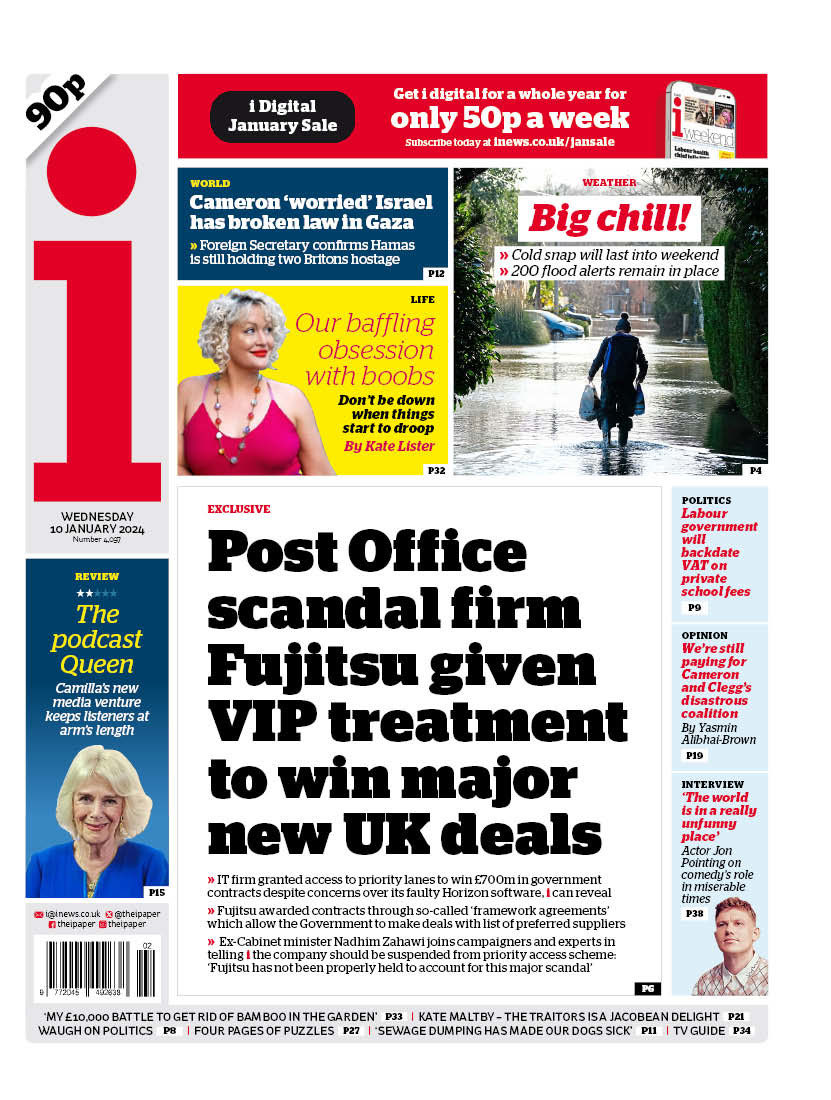 The i highlights Fujitsu’s potential £700m government contracts despite software concerns.