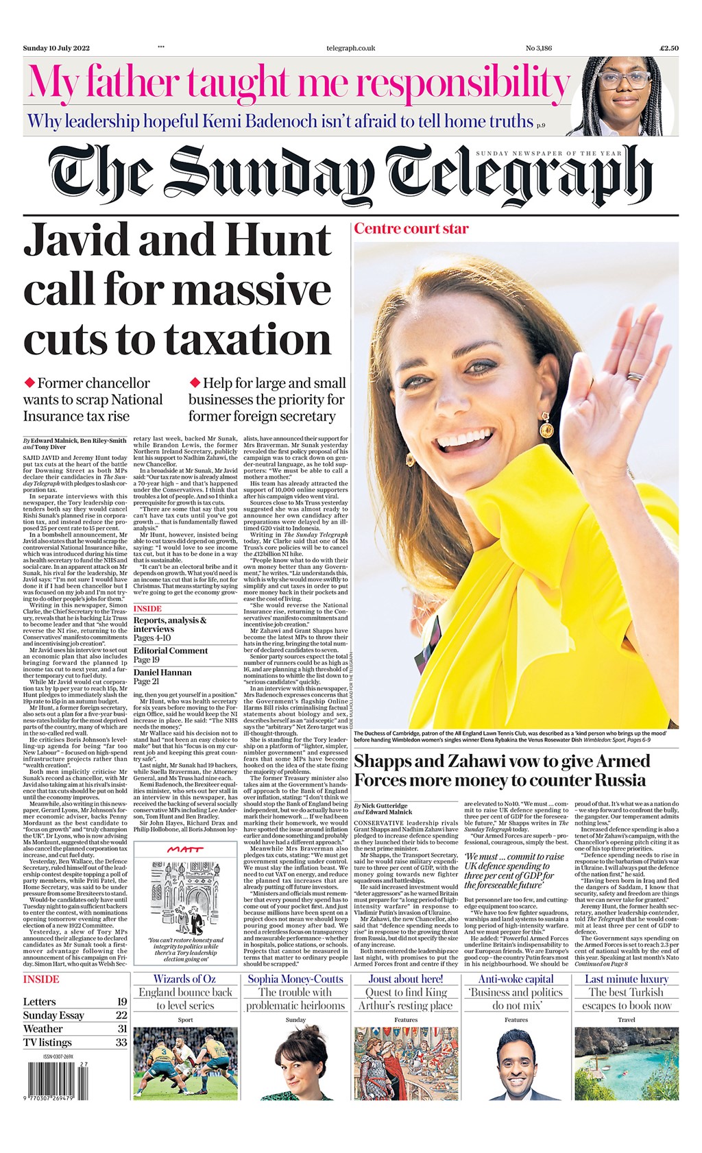 Tax cuts are at the heart of Sajid Javid and Jeremy Hunt’s Tory leadership bids, The Sunday Telegraph reports.