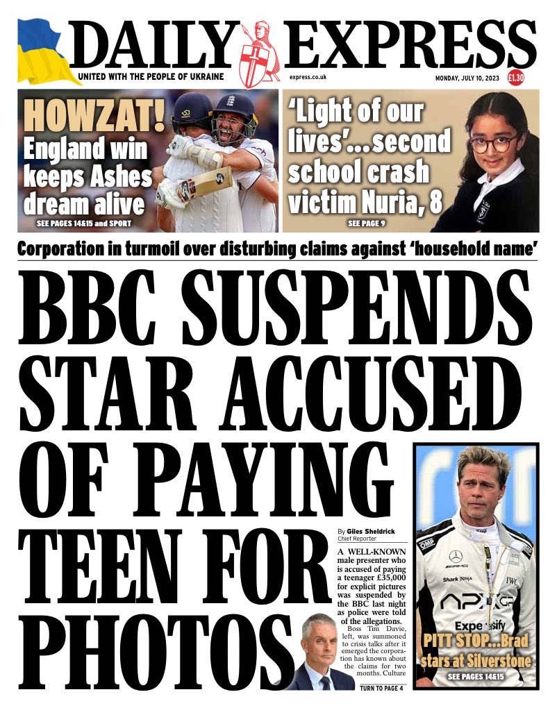 The Daily Express highlights the suspension of an unnamed BBC presenter due to allegations involving explicit photographs.
