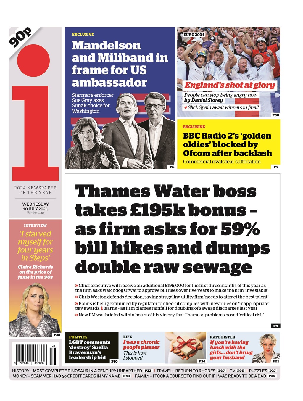 The i reports Thames Water’s chief executive will get an extra £195,000 for the first quarter, as the firm seeks OFWAT’s approval for bill increases to make it “investable.