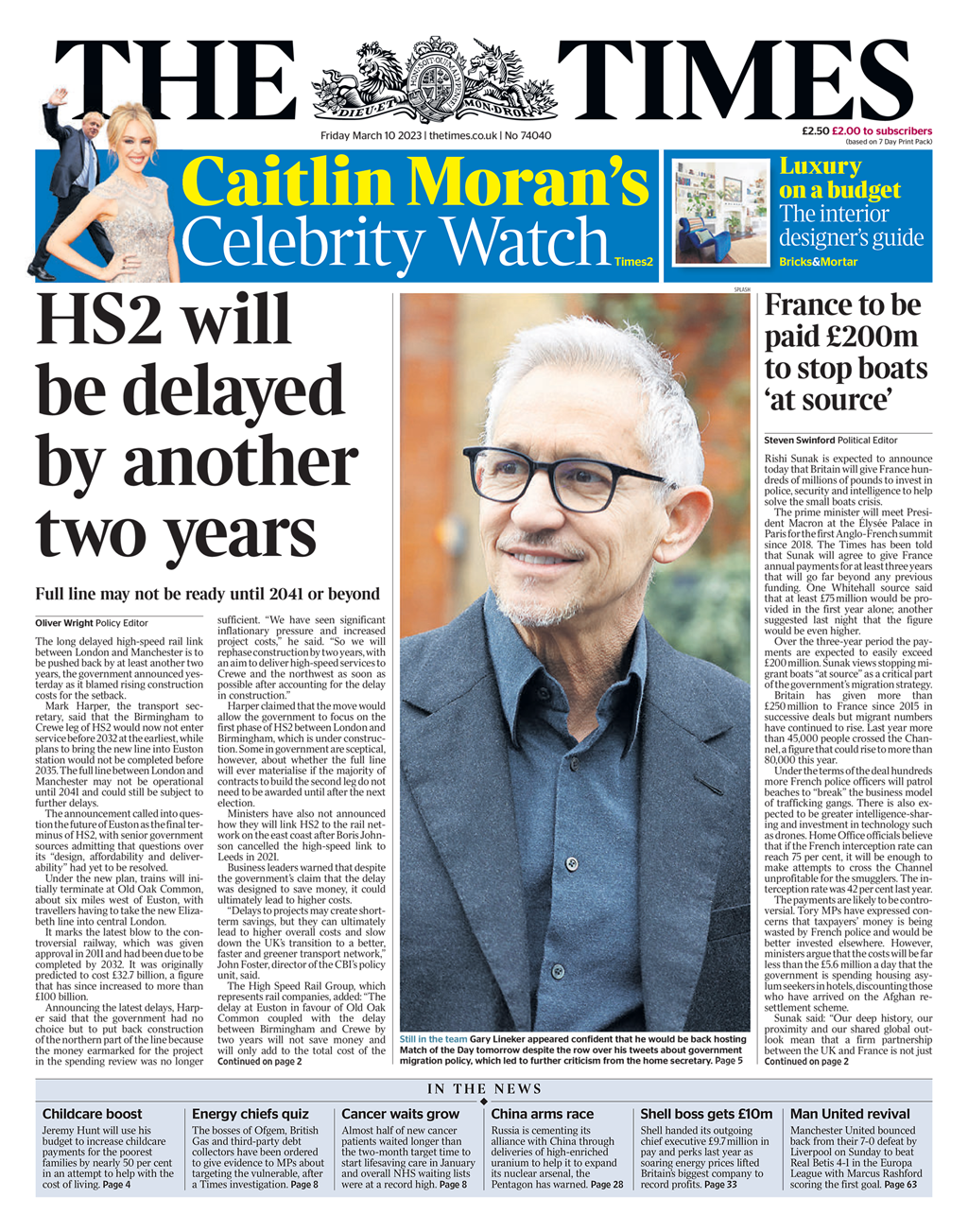 The Times reports that HS2’s London-Manchester line may not be completed until at least 2041, with questions also being raised about whether Euston will be the line’s final London terminus.
