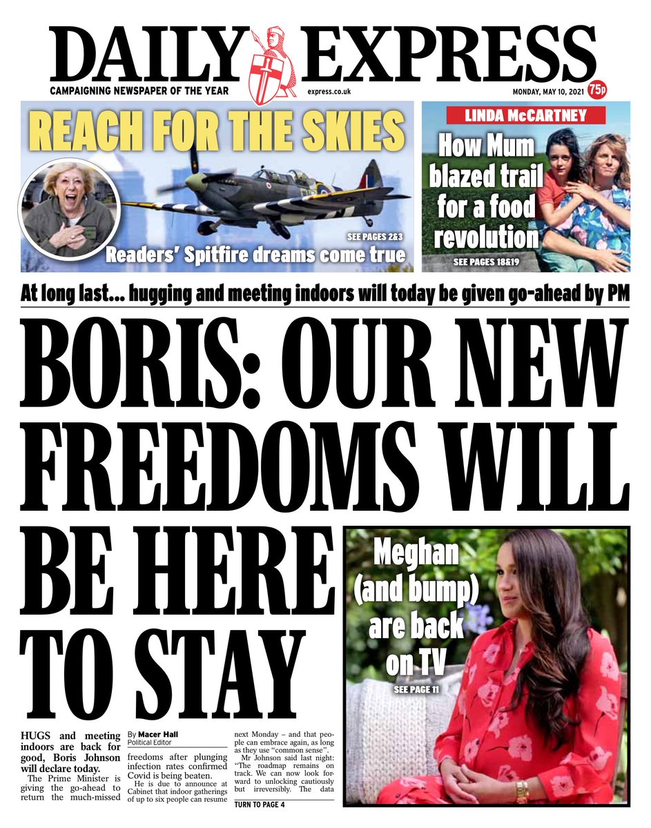 The prime minister will promise that hugs and meeting indoors will be here to stay – that’s on the front of the Daily Express.