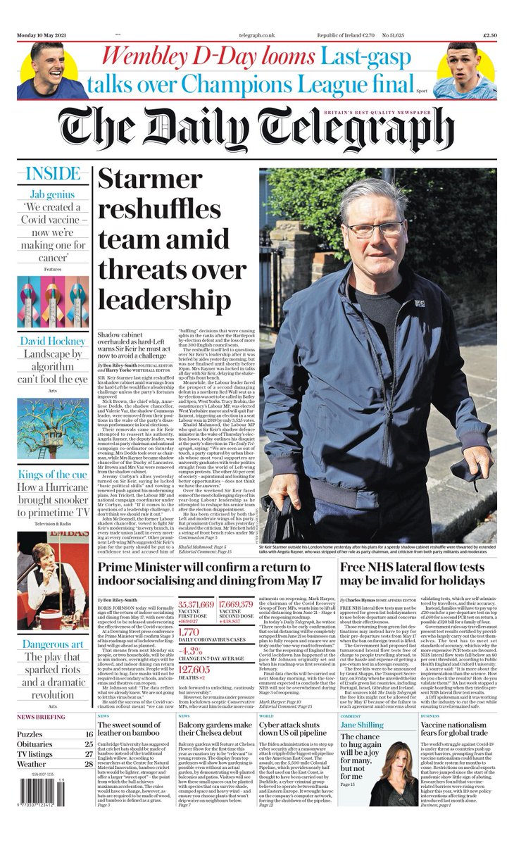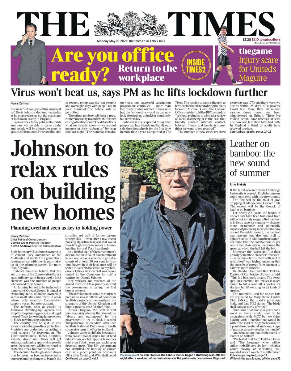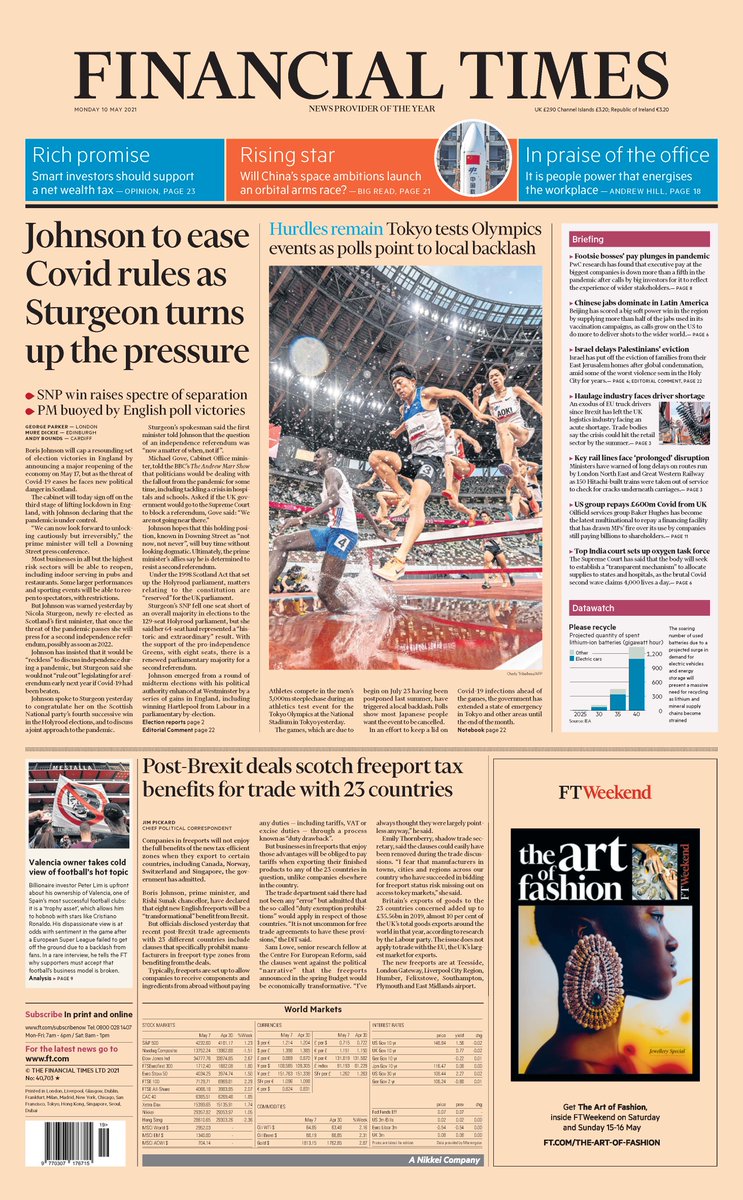 As the threat of COVID-19 eases for the UK, Boris Johnson faces a growing threat to the union from Scotland – that’s on the front of the Financial Times.