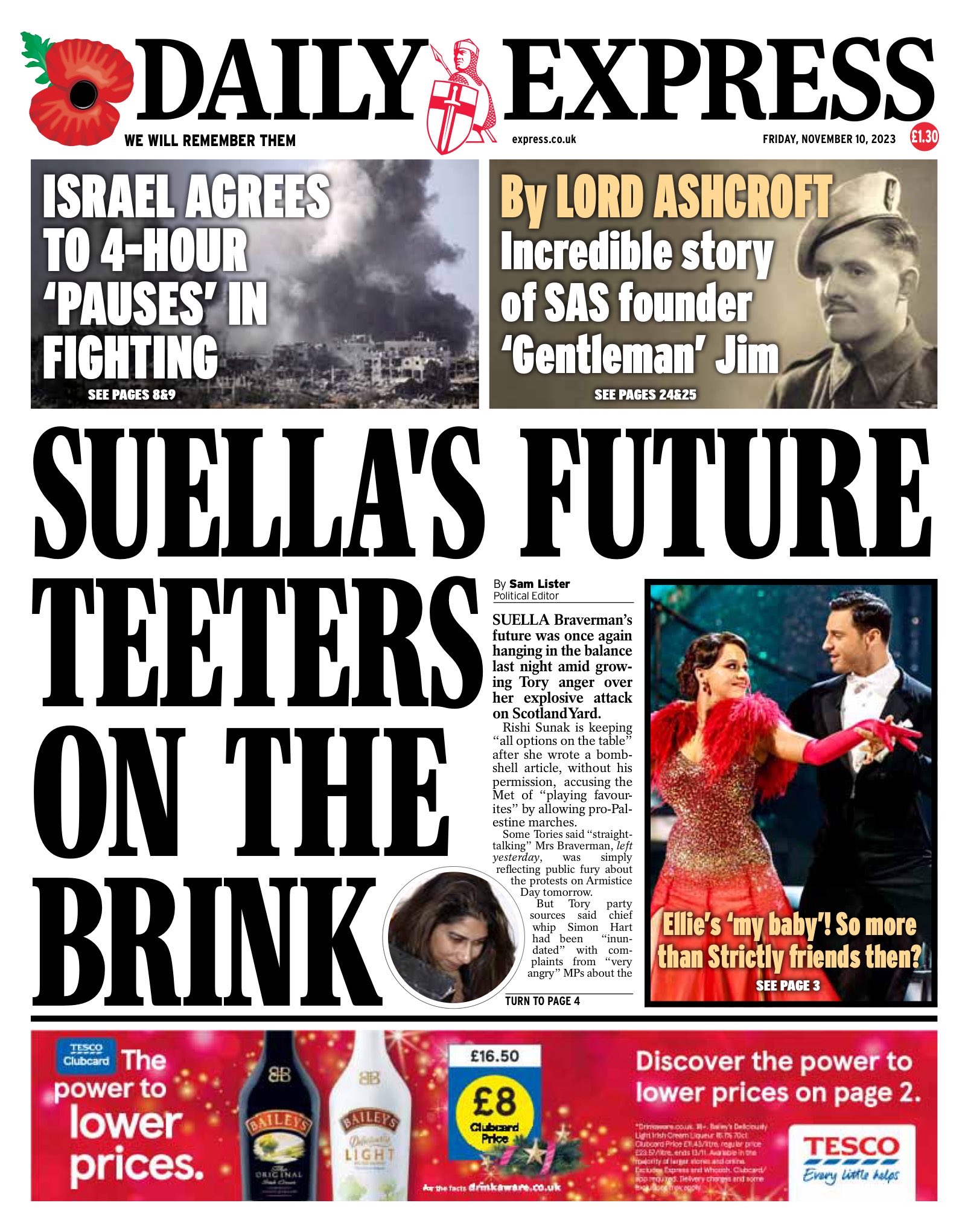 The Daily Express reports on the precarious position of Home Secretary Suella Braverman, who could face dismissal.