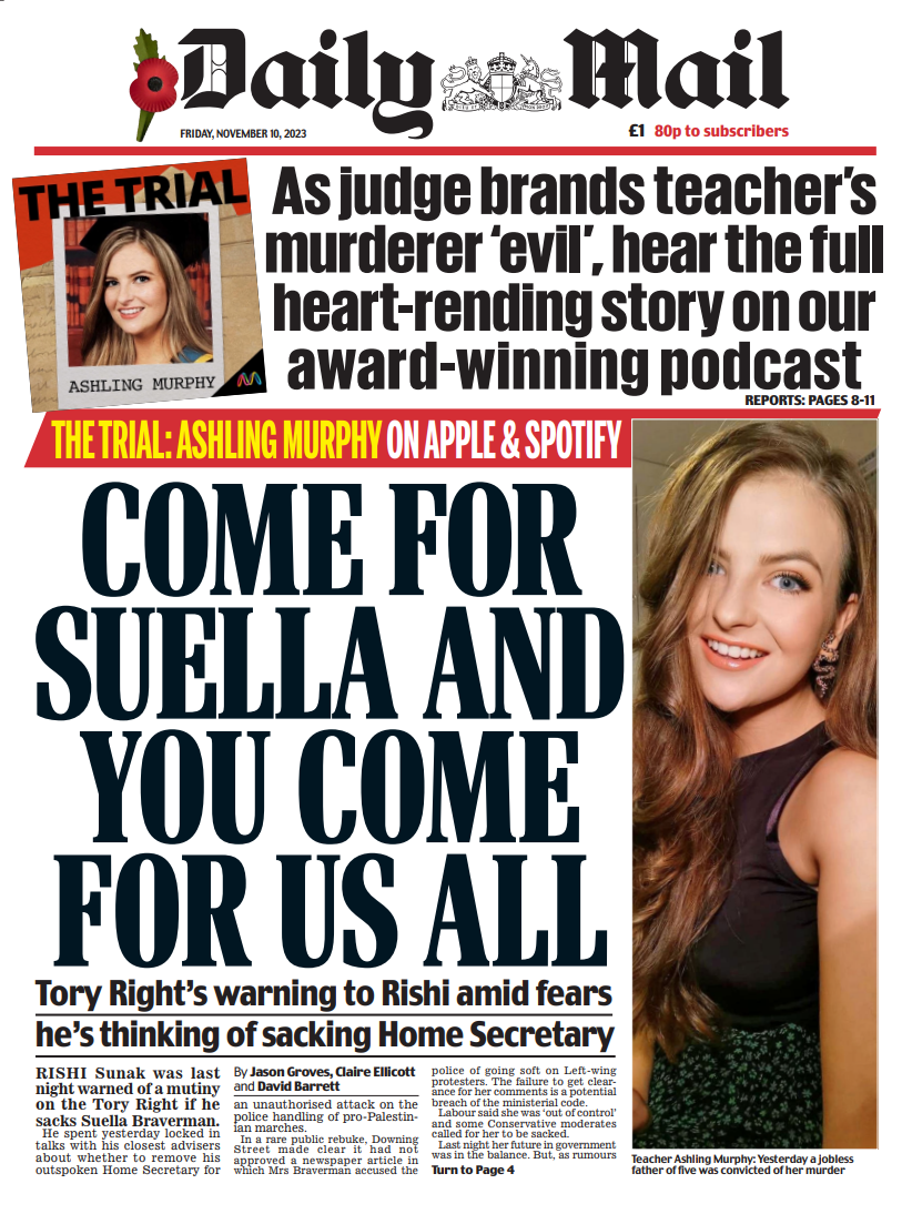 The Daily Mail reports on potential rebellion within the Conservative party if Suella Braverman is dismissed as Home Secretary.