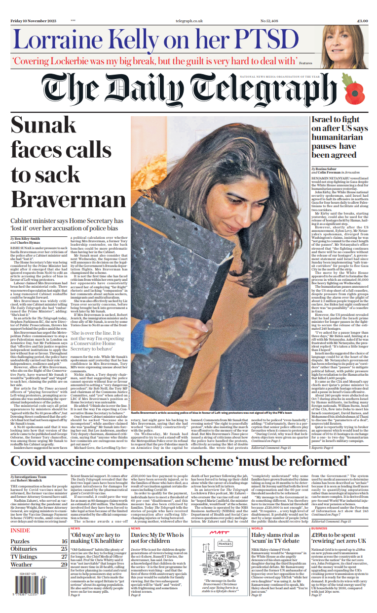 The Daily Telegraph reports on the demands for Suella Braverman’s dismissal, citing a cabinet minister’s critique of the home secretary.