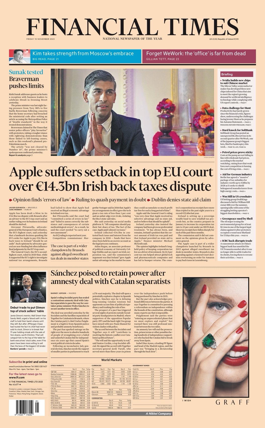 The Financial Times reports on Apple’s setback in its €14.3bn tax dispute with the EU, following a ruling by the bloc’s highest court.