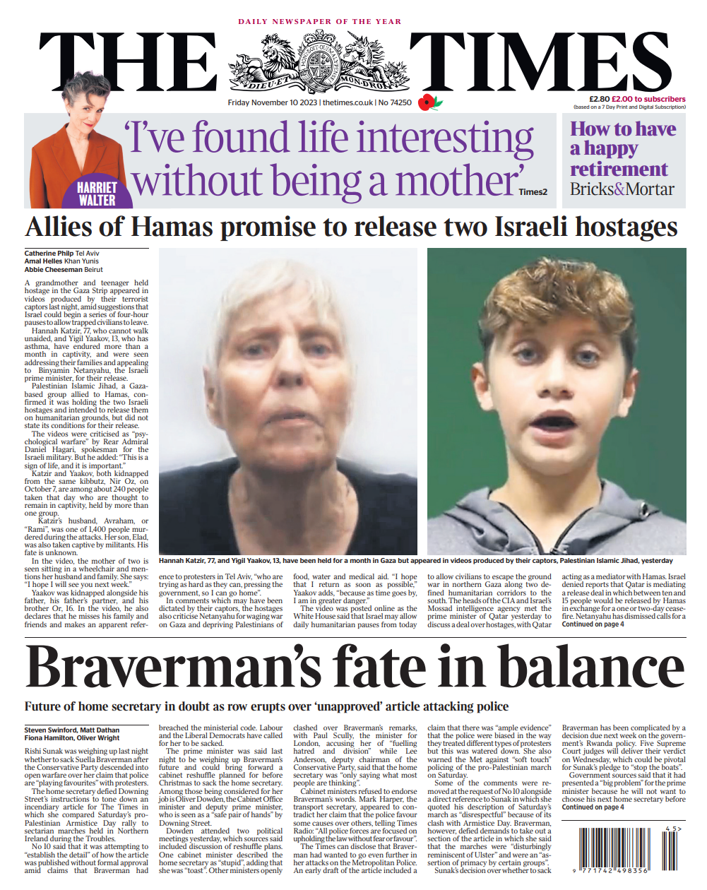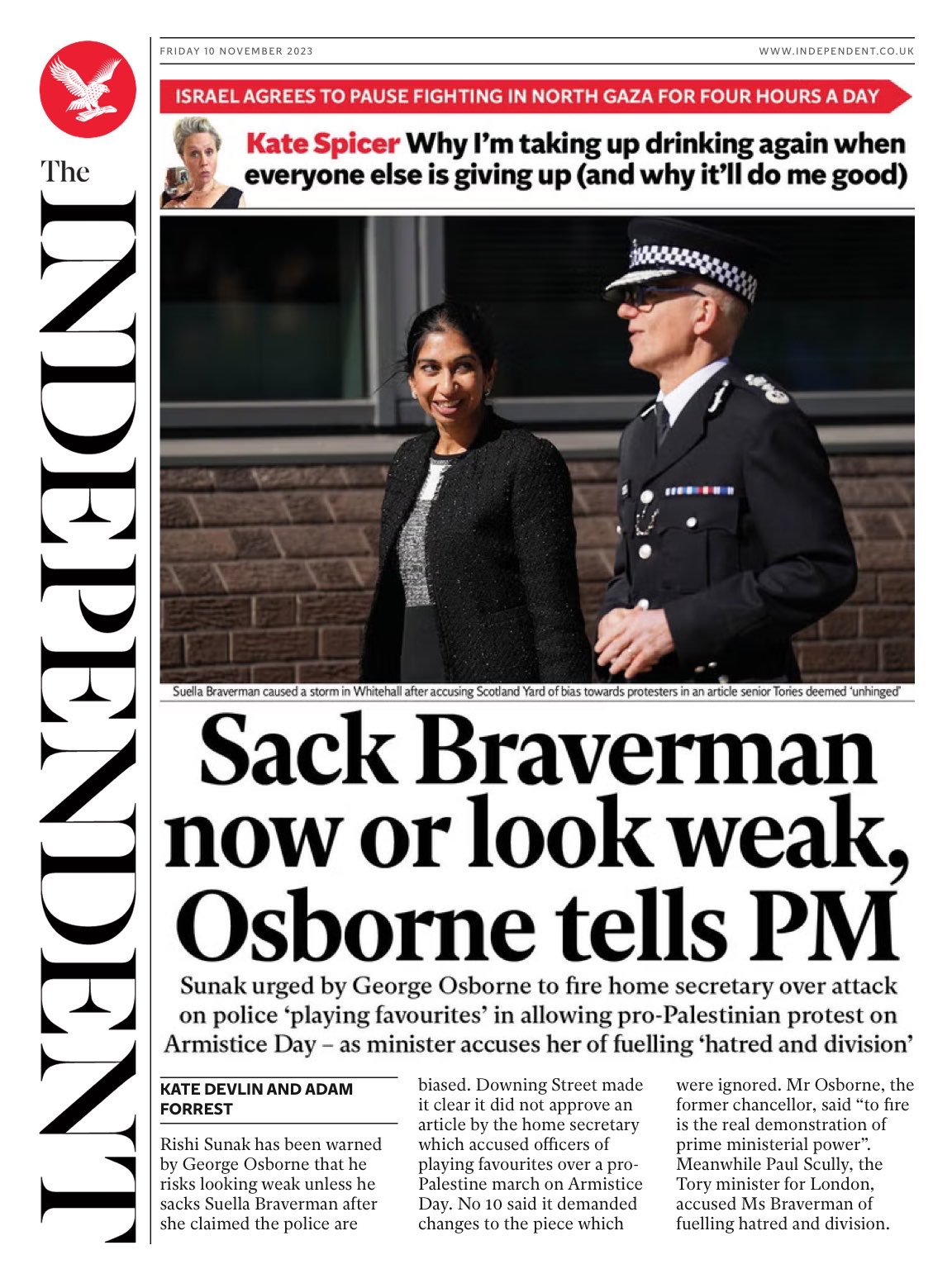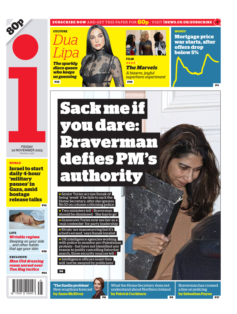 The i paper reports on the controversy surrounding Suella Braverman’s role, as Rishi Sunak faces criticism for his alleged inability to dismiss his Home Secretary.