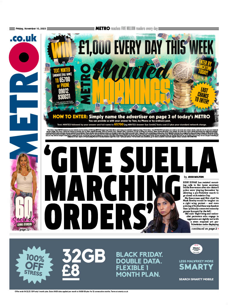 The Metro reports on the escalating pressure on the prime minister to dismiss the home secretary following her condemnation of the police’s decision to permit pro-Palestine marches on Armistice Day.