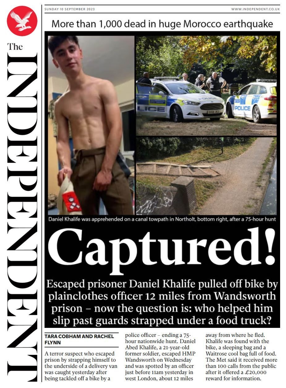 In The Independent, a covert officer’s daring tackle ended Khalife’s escape, succinctly headlined “Captured!”