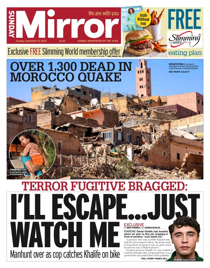 The Morocco earthquake dominates the Sunday People’s coverage with a vivid “Hell on Earth” headline.