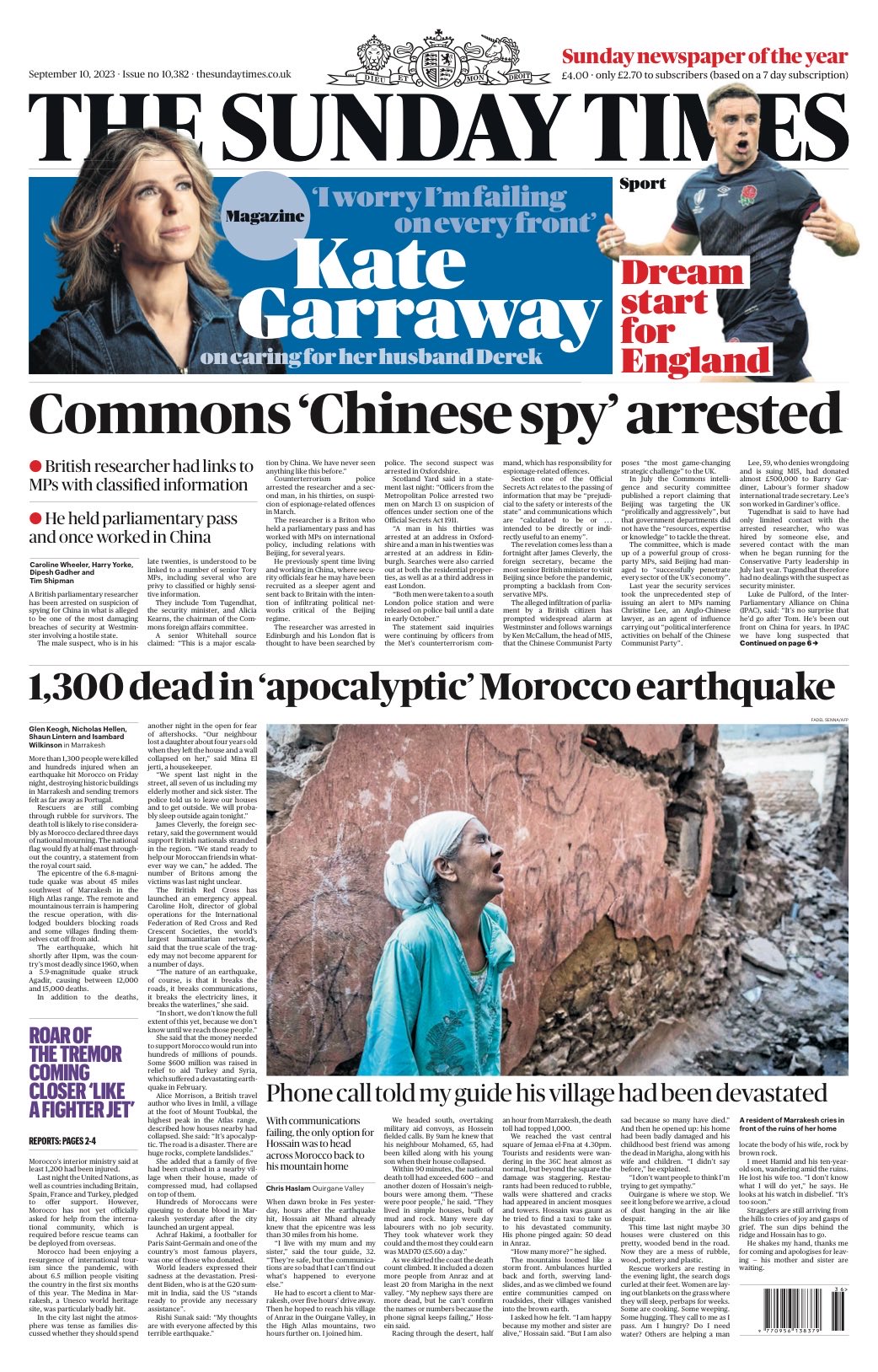 The Sunday Times reveals an arrest of a British parliamentary researcher, suspected of espionage for China, hinting at a significant security breach.