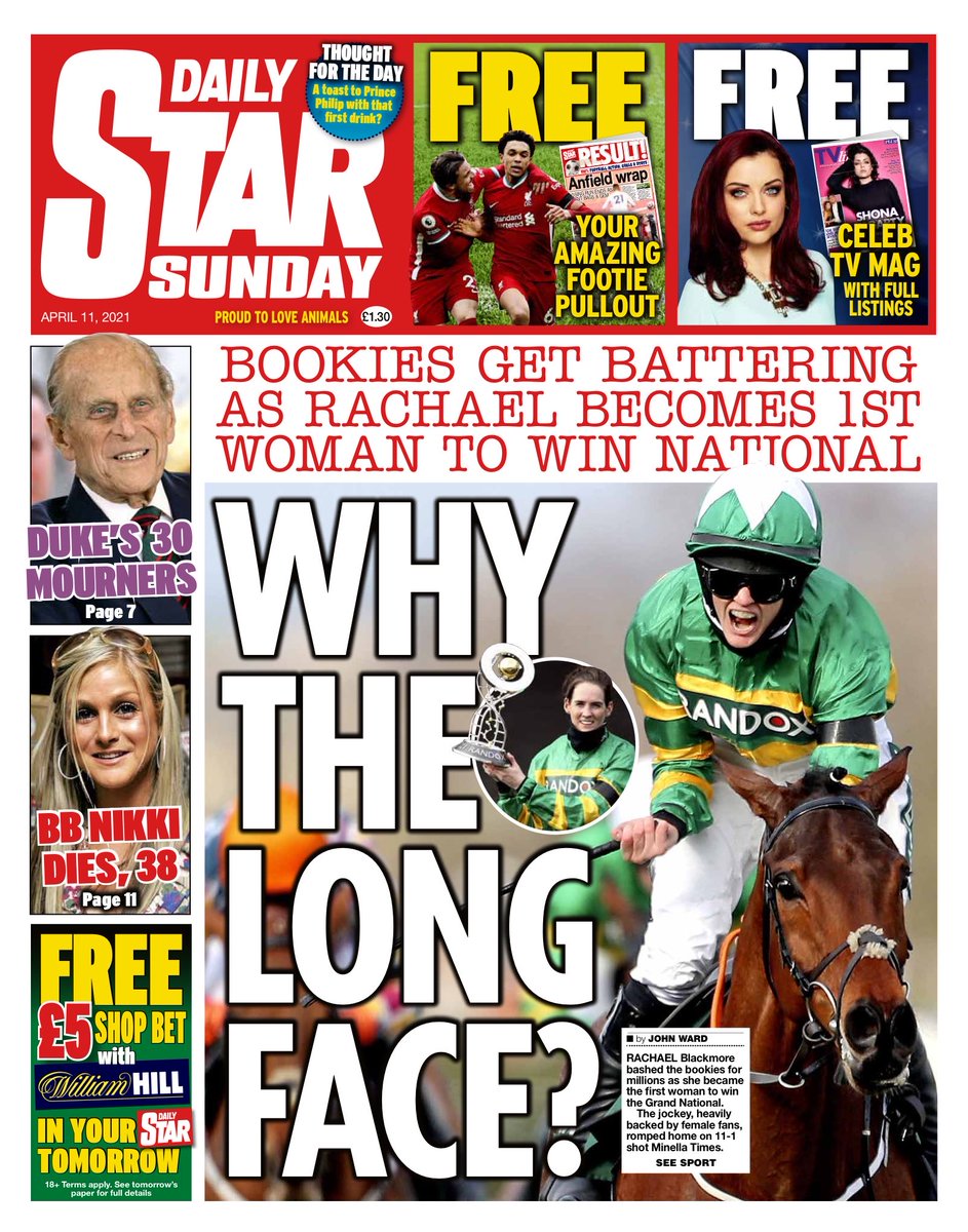 Jockey Rachael Blackmore’s historic victory at the Grand National dominates Daily Star Sunday’s front page. Blackmore, the first woman ever to win the famous race, apparently “bashed the bookies for millions” riding 11-1 shot Minella Times first across the line.