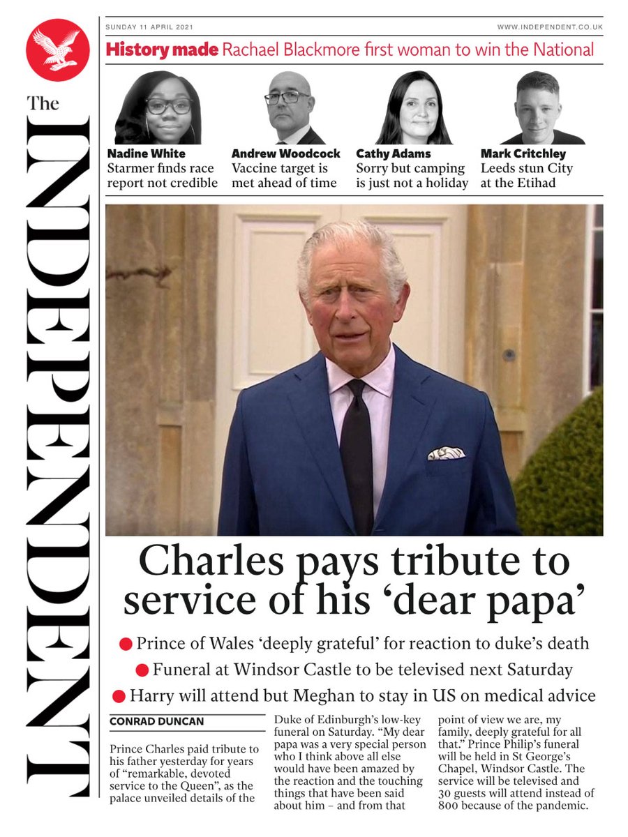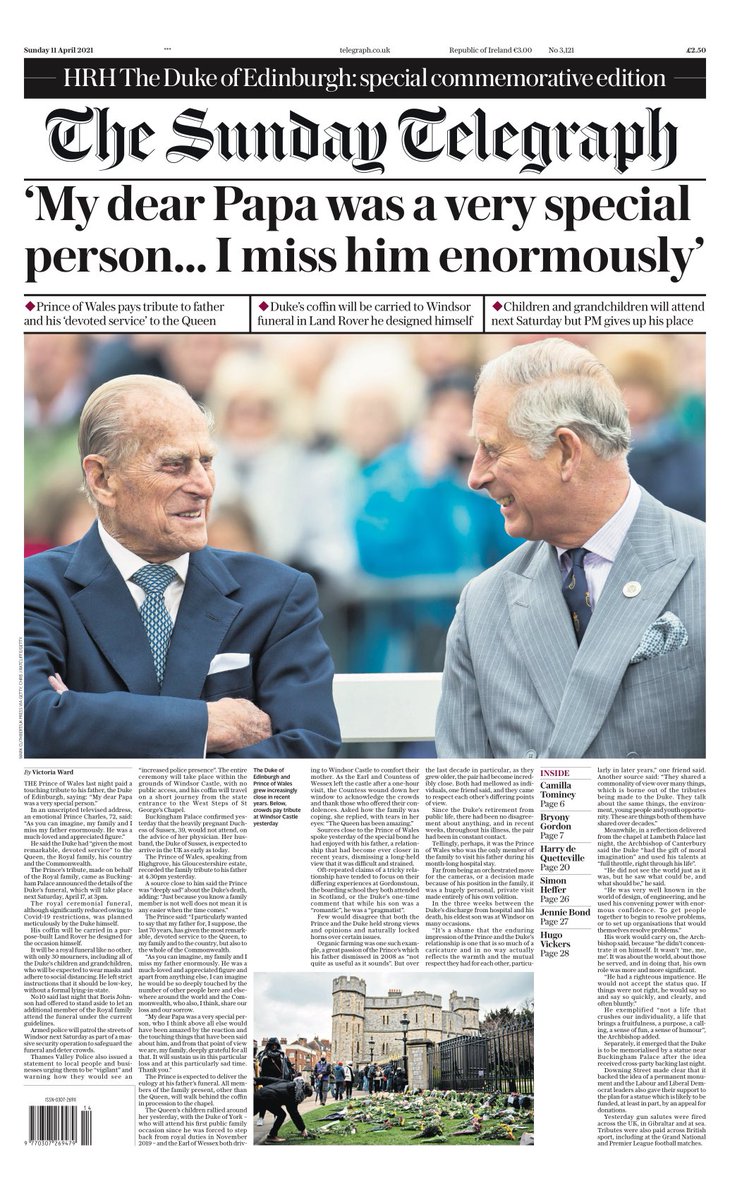 The Sunday Telegraph has produced a commemorative edition of its paper. It too, leads with Prince Charles’s unscripted television address in which he describes his father as “a very special person”.