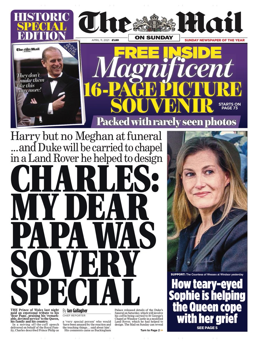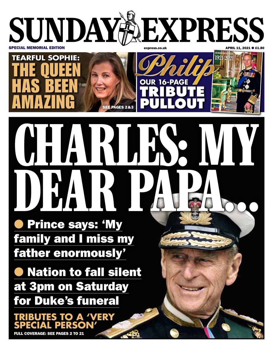 Sunday Express carries Prince Charles’s admission that he and his family miss his father “enormously” along with Sophie, the Countess of Wessex’s revelation that “the Queen has been amazing”.