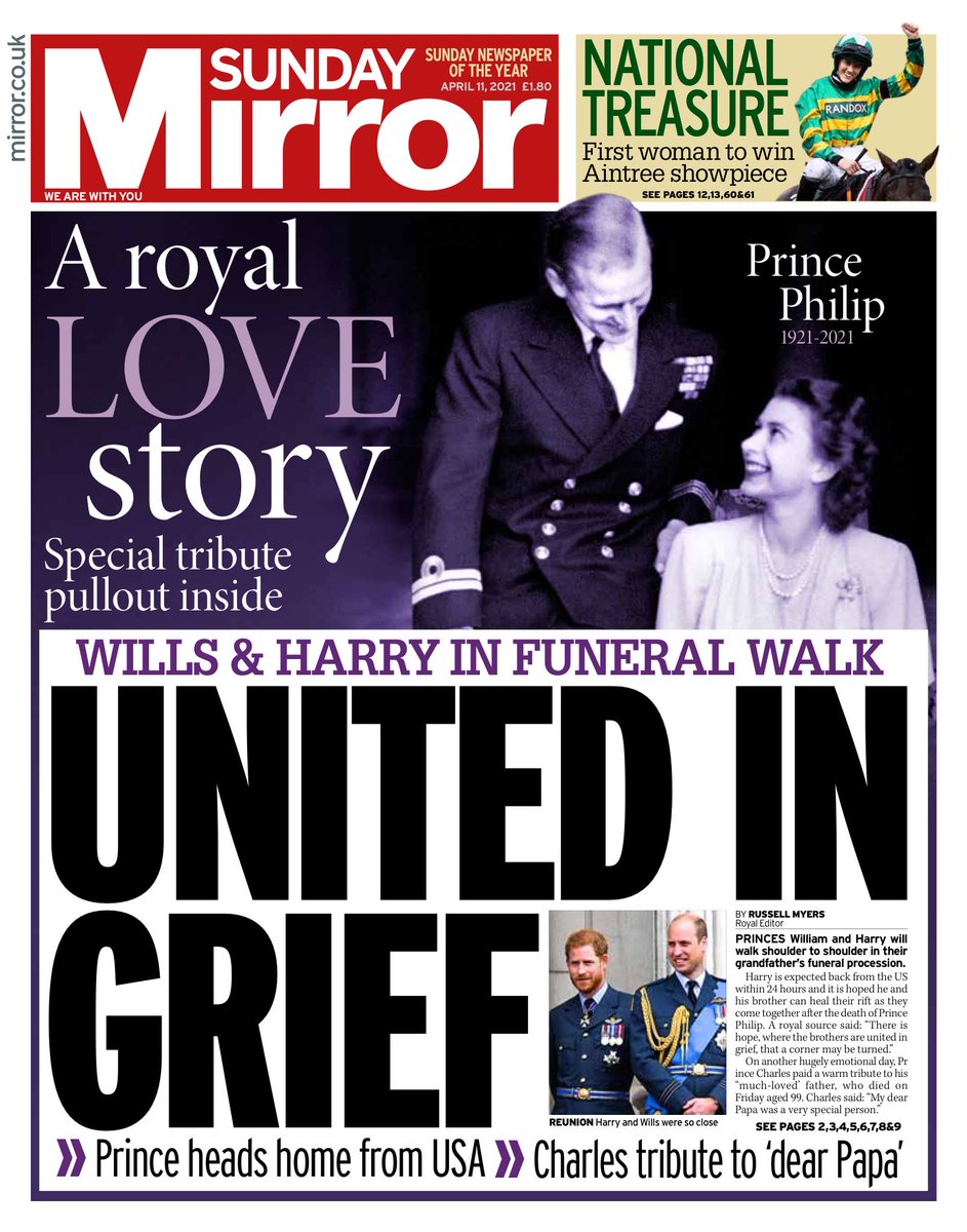 News that royal brothers William and Harry will both walk in Prince Philip’s funeral procession, has prompted the Sunday Mirror headline, “united in grief”.