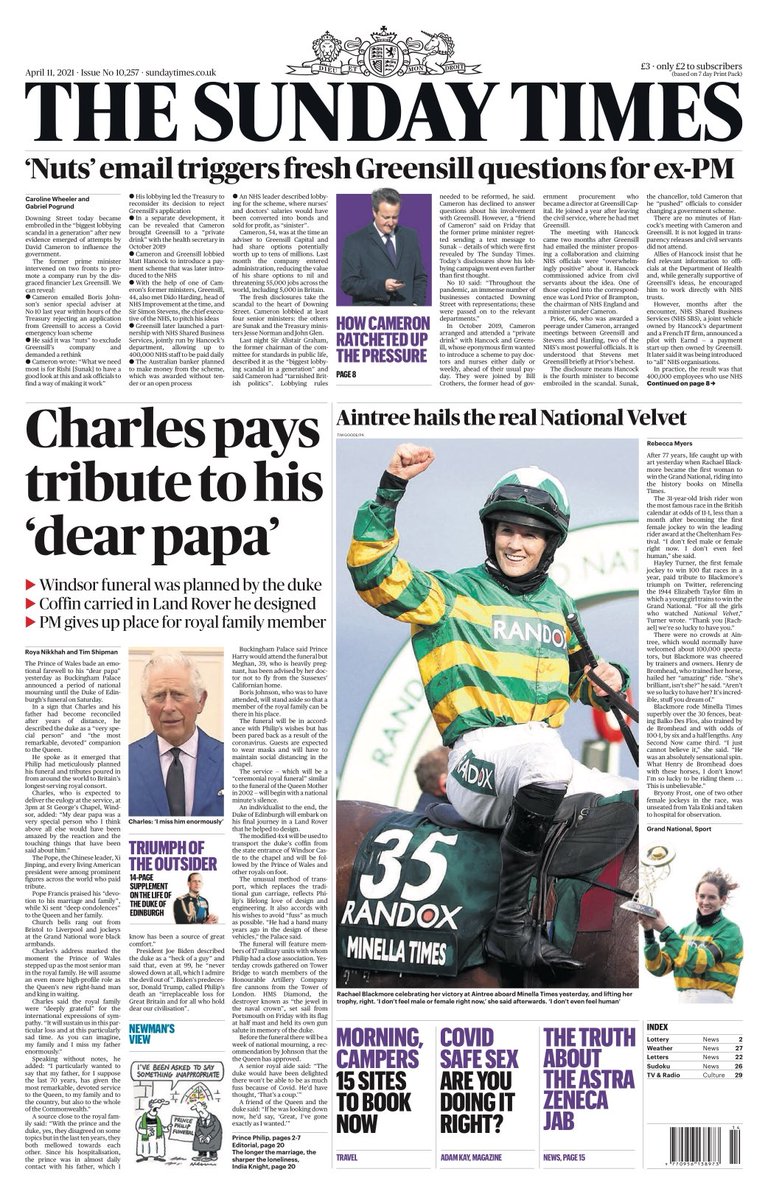 The Observer features Prince Charles’s moving tribute to his “dear Papa”. It also warns a third coronavirus wave could be on the way, due to a number of virus hotspots still remaining in some areas of the UK.