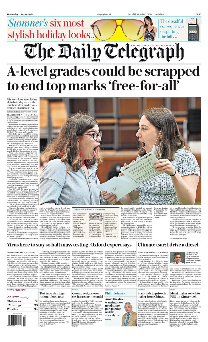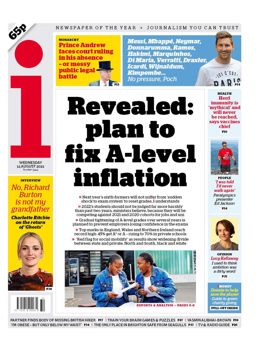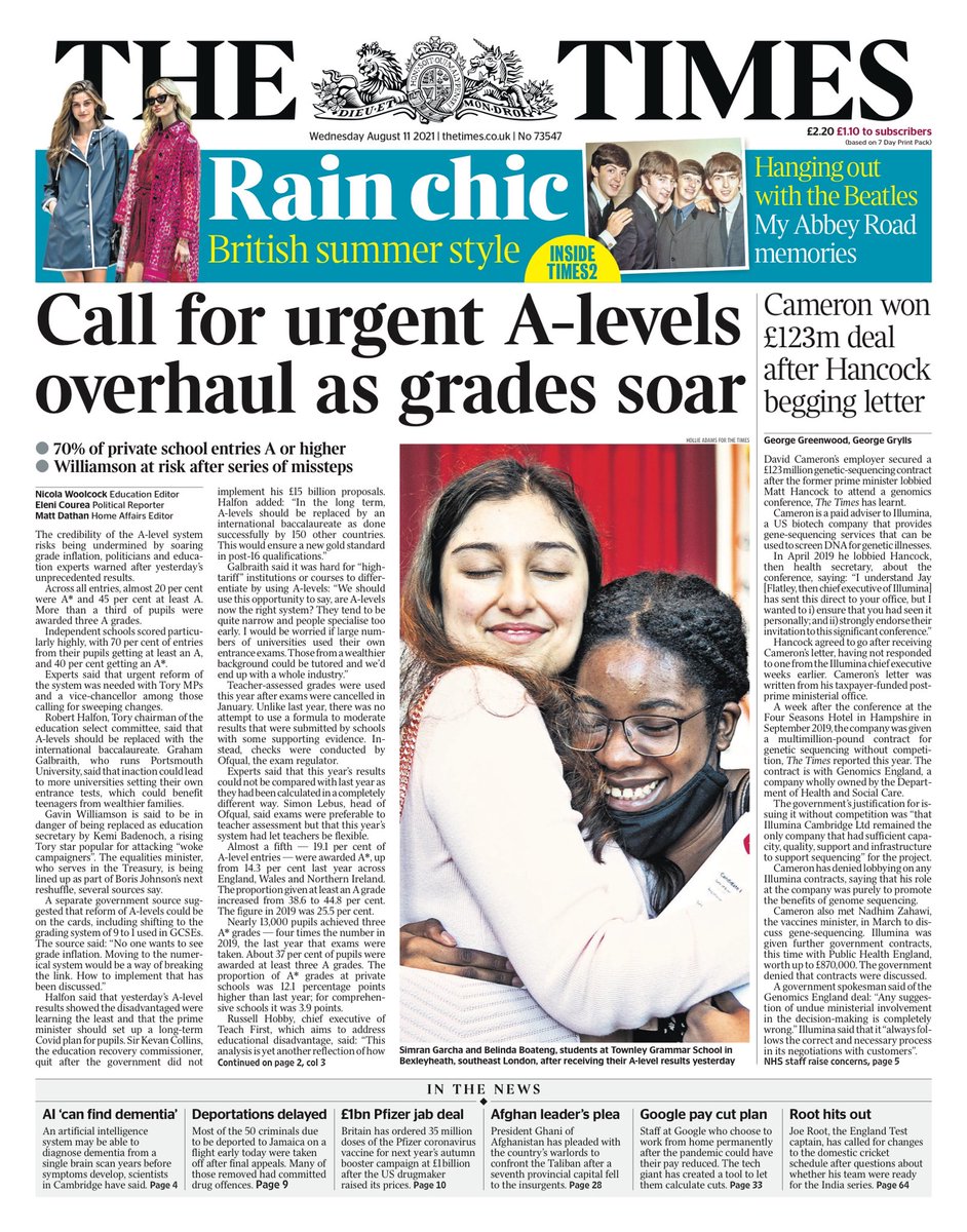 The Times splashes on calls for an urgent overhaul of A-levels as more than a third of students were awarded three A grades.