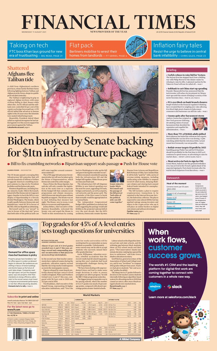 The Financial Times splashes on the news that President Joe Biden has achieved a major victory after the US Senate passed a $1trn infrastructure bill to upgrade America’s crumbling transport system.
